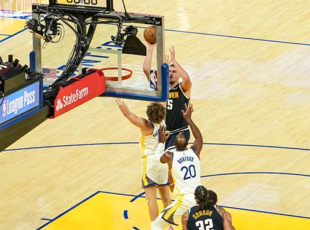 比賽最后30秒,戈登接到約基奇的傳球,在45度角獲得空位三分機(jī)會。戈登這個時候已經(jīng)投進(jìn)9個三分,還能獲得空位機(jī)會,可見約基奇的進(jìn)攻威脅。戈登再次命中三分,掘金領(lǐng)先勇士三分,比賽時間只剩下25.7秒。