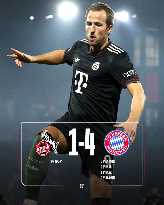 這場比賽率先進(jìn)球的是科隆。依靠一次角球機(jī)會,阿赫頭球頂進(jìn)。不過,只過了5分鐘,拜仁就扳平了比分。路易斯-迪亞斯在禁區(qū)內(nèi)補射破門。第40分鐘,拜仁反超比分。哈里-凱恩在角度極小的情況下轉(zhuǎn)身射門打進(jìn),難度極高。下半場哈里-凱恩再接再厲,頭球頂進(jìn),梅開二度。隨后,奧利塞進(jìn)球擴(kuò)大比分,徹底殺死比賽。最終的比分定格為4-1,拜仁淘汰科隆。
